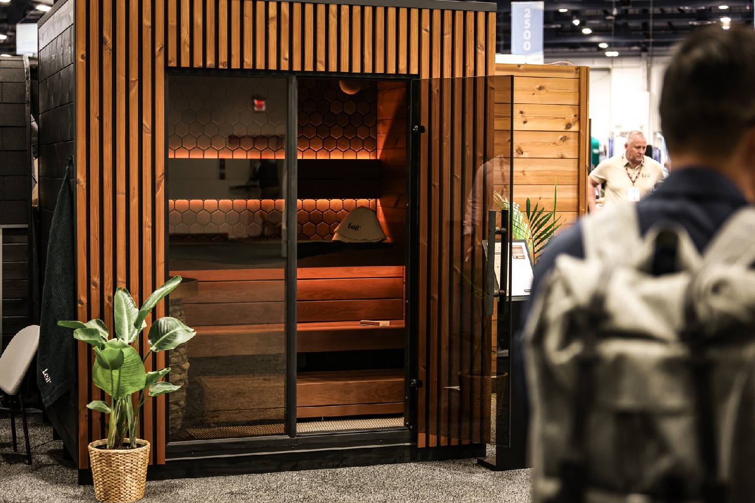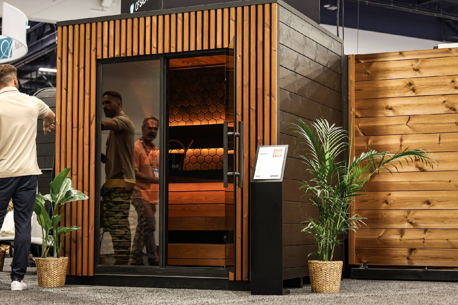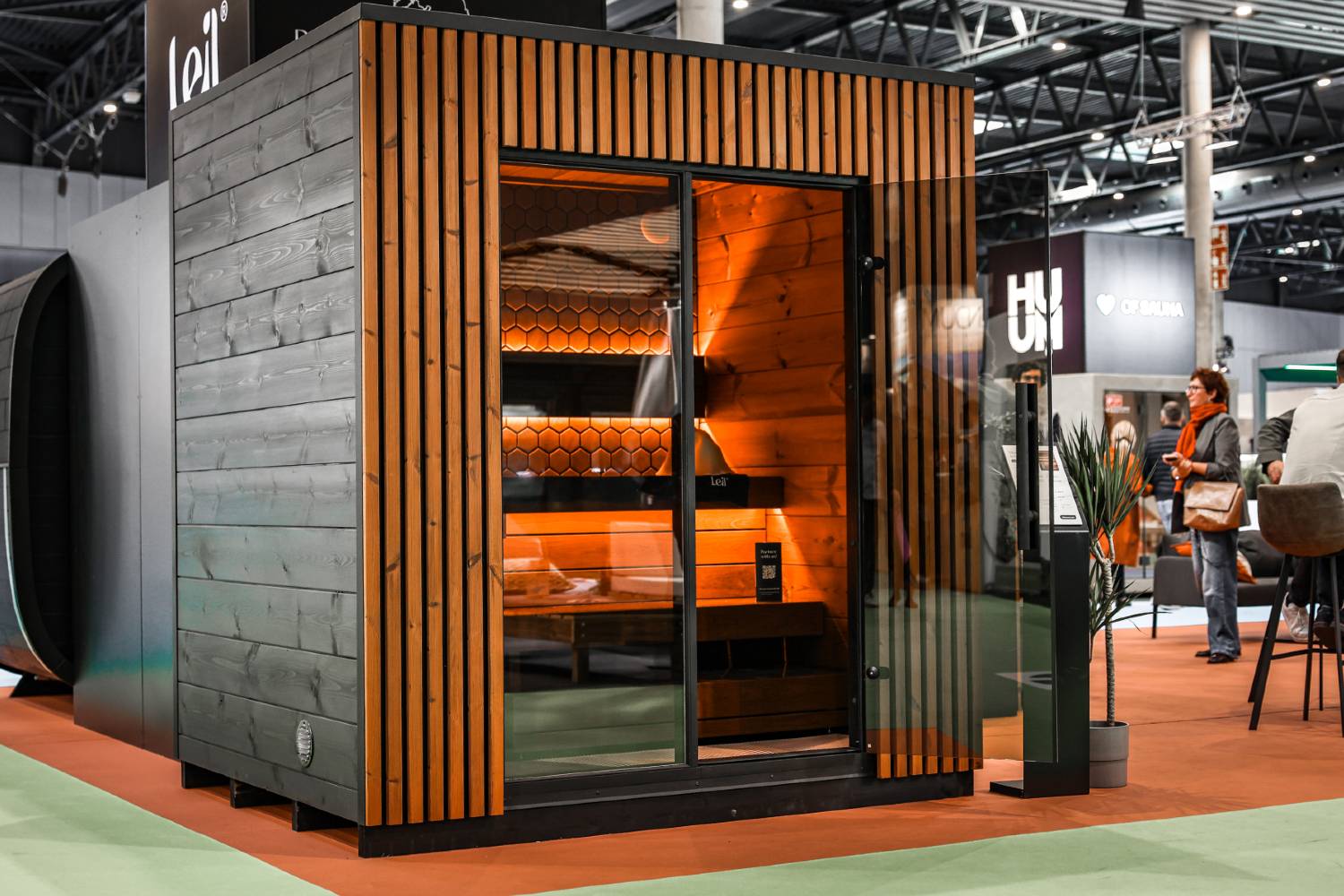 Inside the Leil® Viva 210 sauna, the emphasis is on comfort, quality, and lasting performance. Benches, backrests, ceiling, floor, and walls are all crafted from 100 percent Thermowood, selected for its smooth surface and excellent heat resistance. Optional decorative wall panels allow you to personalise the interior while keeping the installation process simple. Warm LED lighting creates a calm and relaxing atmosphere, while a carefully designed ventilation path ensures steady airflow for an even and satisfying leil experience.